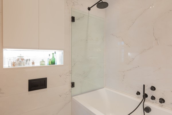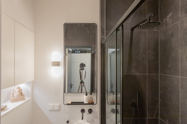 Through the communal entrance, you reach the entrance of the house at the rear of the national monument “de Saayer.” The house has been recently completely renovated and remodeled, and the entire home features a herringbone oak floor. The spacious hallway provides access to all rooms. There is one bedroom with a sofa bed and a master bedroom with a double bed and an en-suite marble bathroom equipped with a bathtub, toilet, and sink. The second bathroom has a rain shower and sink. The living room has a high beamed ceiling. Access to two gardens, one being the large inner garden and the other at the rear, allowing you to fully enjoy the sun. The open kitchen with an island is fully equipped.