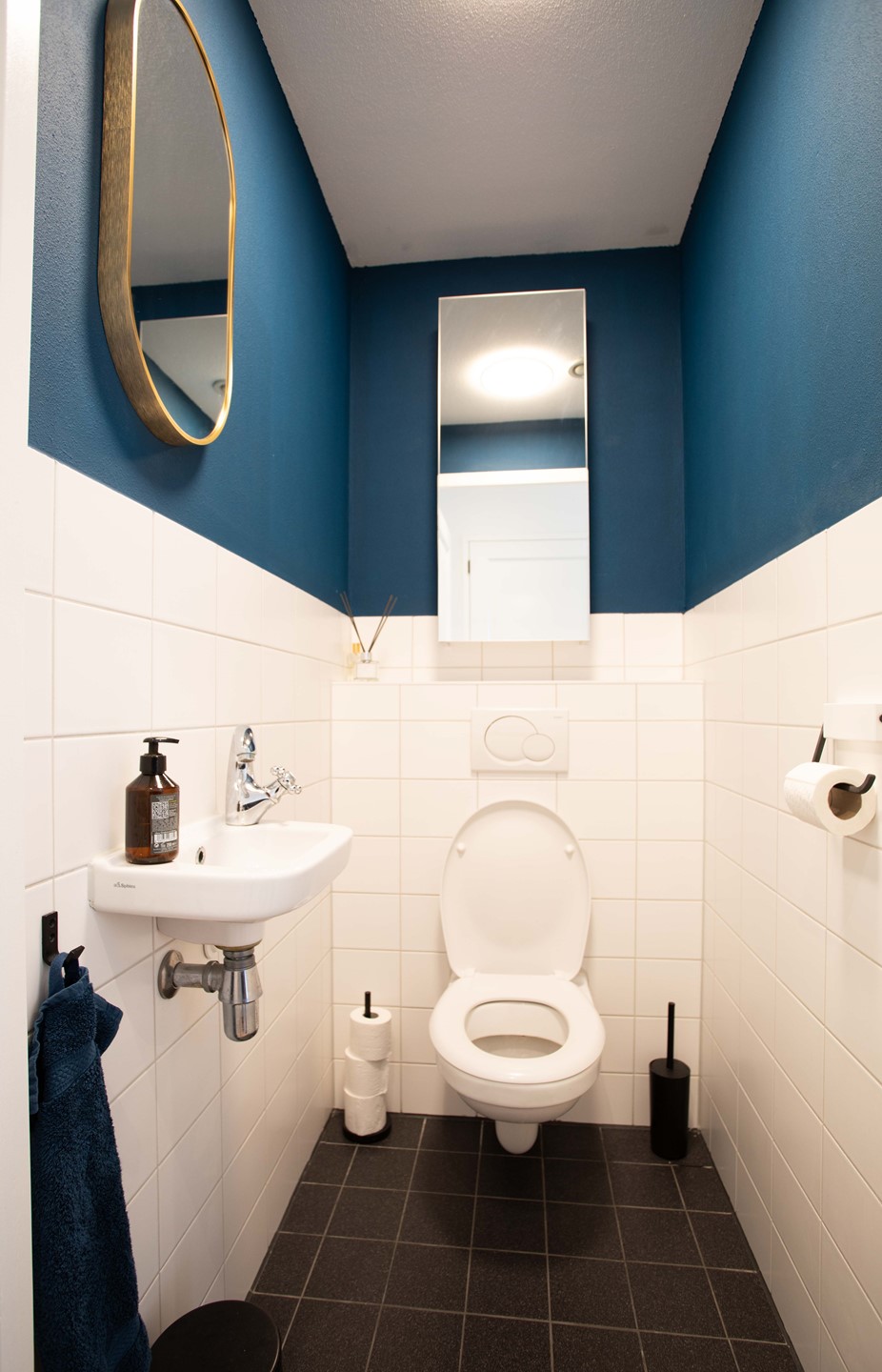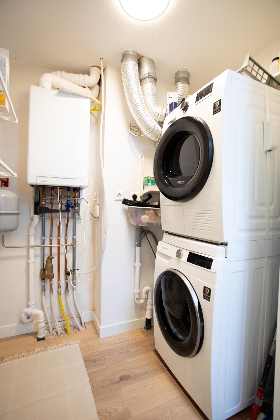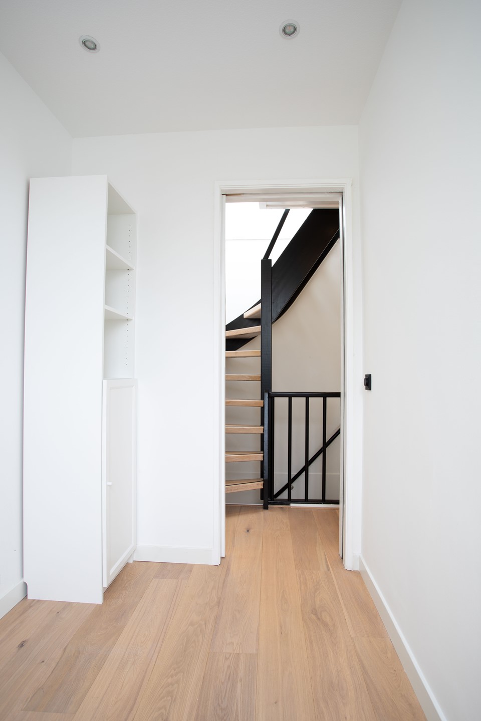De keuken is uitgerust met hoogwaardige apparatuur, waaronder een Quooker voor kokend water, een inductiekookplaat, een koelkast en vriezer, en voldoende kastruimte. Via openslaande deuren heb je toegang tot het balkon aan de achterzijde. Op deze verdieping is een separaat toilet.