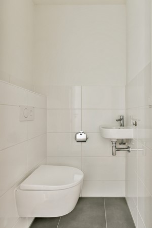 Upon entering, you step into the hallway, which provides access to the meter cupboard, a separate toilet, and the staircase leading to the first floor.