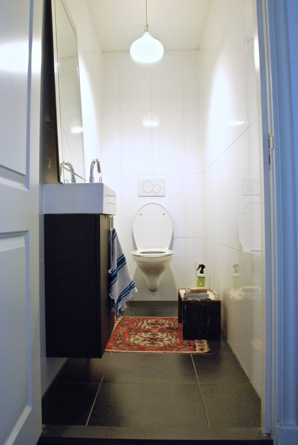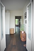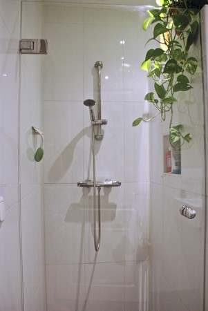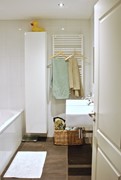 The bathroom is fitted with a walk-in shower, bathtub, and double sink. Additionally, there is a separate toilet in the hallway.