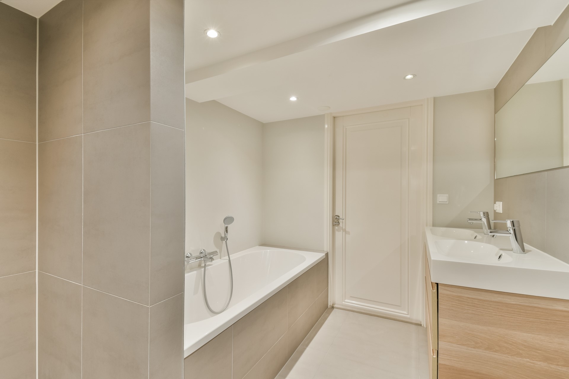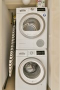 The apartment on the fourth floor is accessible by elevator or stairs. The elevator opens directly into the hallway of the apartment. From the hallway all rooms of the apartment can be reached. At the rear are all three bedrooms, the largest of which has an ensuite bathroom. This bathroom is fitted with a double washbasin with cabinet, a bathtub, a toilet, a bidet and a walk-in shower. The second bathroom has a double washbasin with cabinet, a walk-in shower and a toilet. Next to the second bathroom is the laundry room with a washing machine and dryer. At the front of the apartment is the living room with open kitchen. The kitchen is equipped with a cooking island with gas hob, a combi oven-microwave, a dishwasher and a freestanding refrigerator.