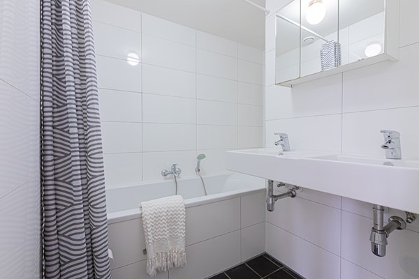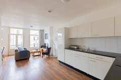 Entrance via the communal staircase on the second floor. The living room with fully equipped open kitchen is located at the front overlooking the Hugo de Grootplein. There are two bathrooms, the first with a shower and the second with a bathtub. At the rear is the quiet bedroom with double bed and wardrobe and access to the balcony.