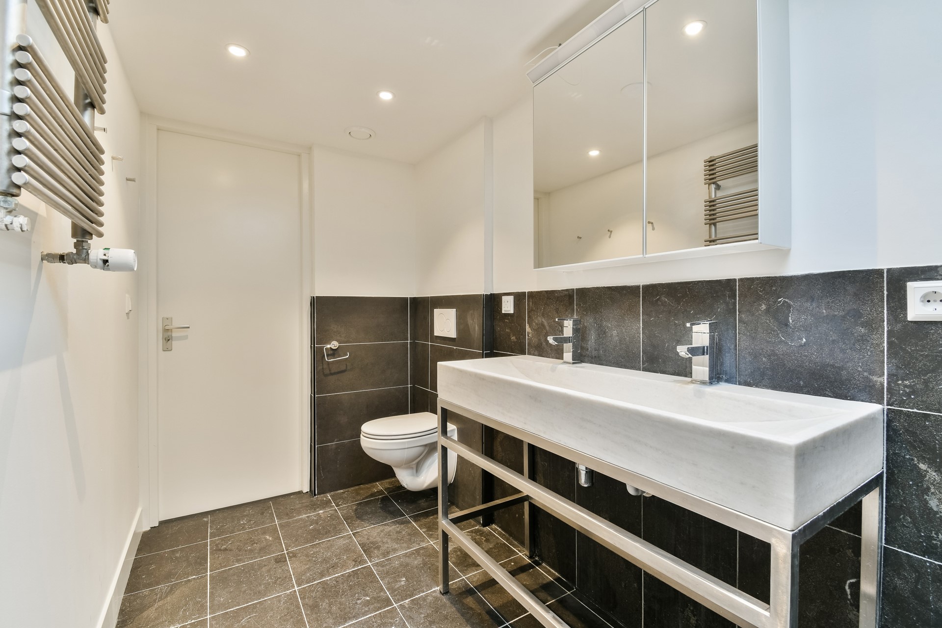 The spacious bathroom is equipped with a walk-in shower, double washbasin with mirrored cabinet, and toilet.