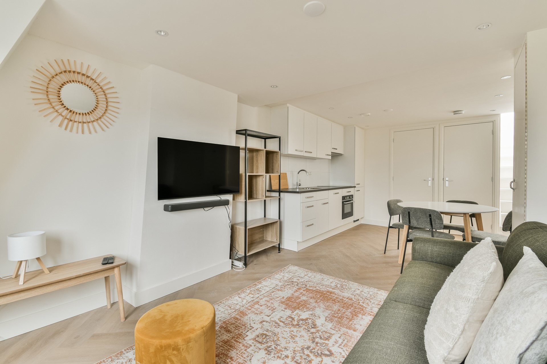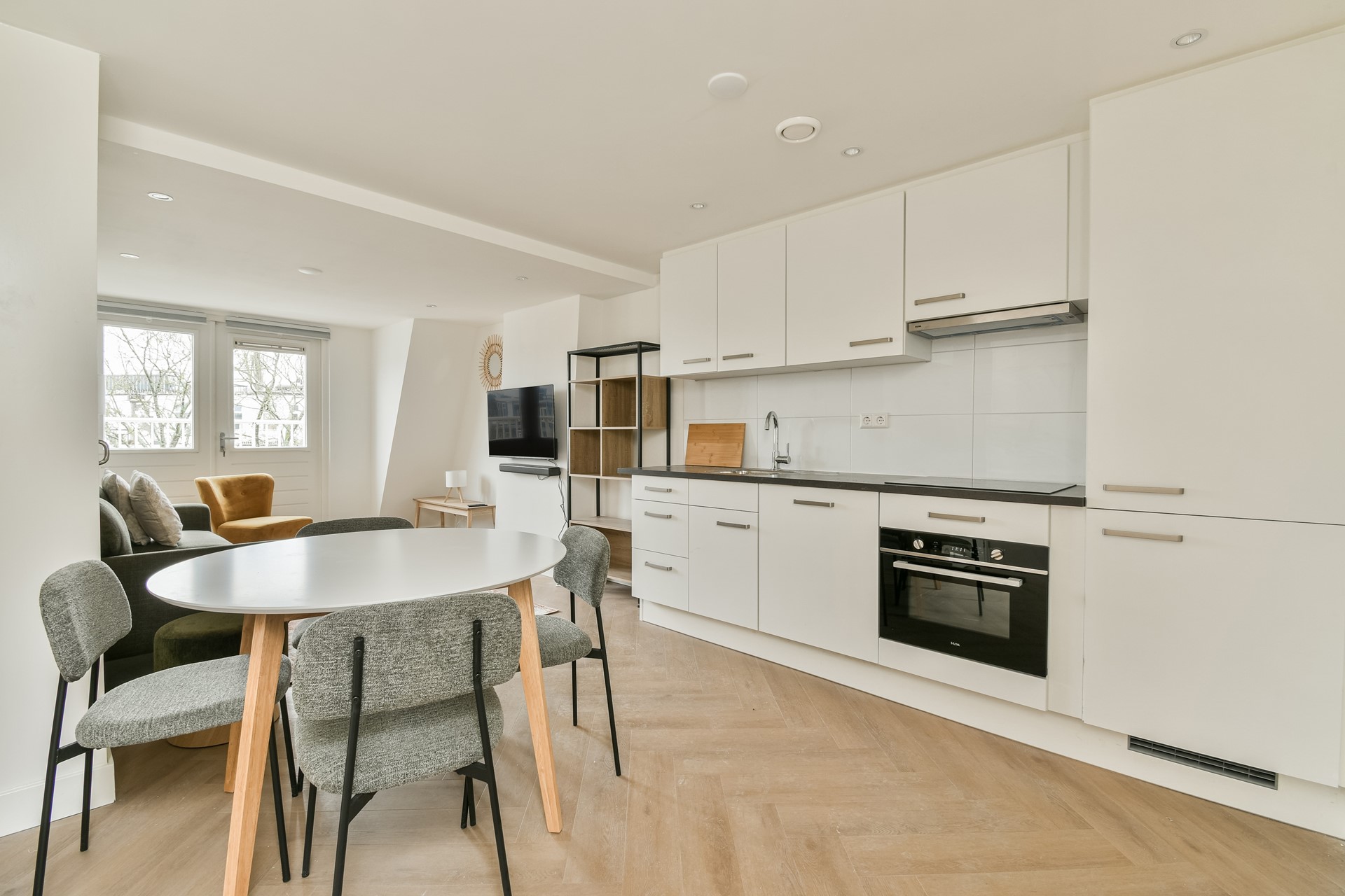 The modern kitchen is fully equipped with all necessary built-in appliances, including an induction cooktop, combi microwave/oven, refrigerator, freezer, and dishwasher. Adjacent is the bright living room with access to the balcony.