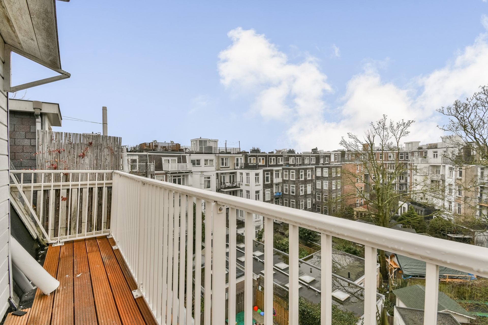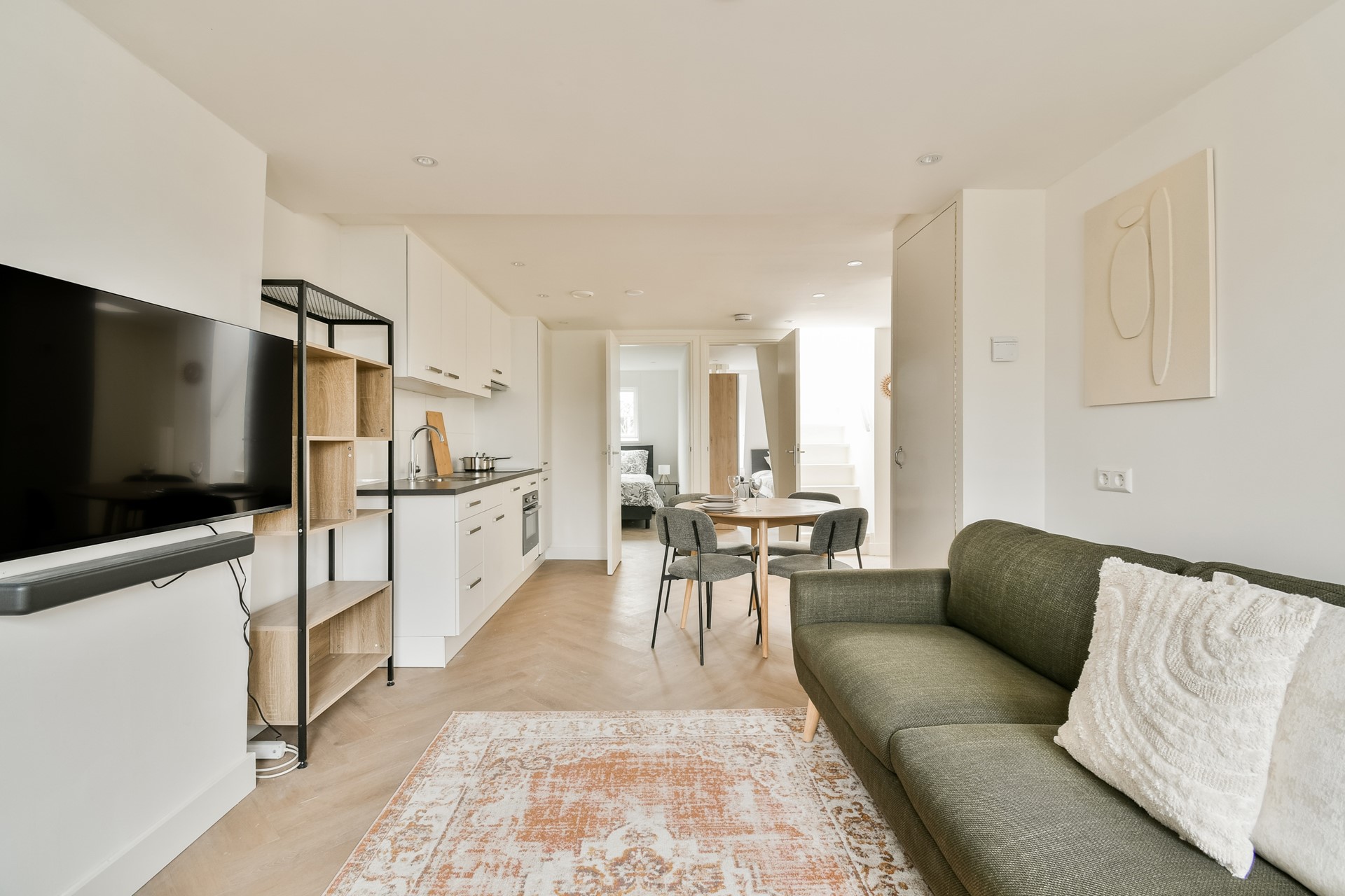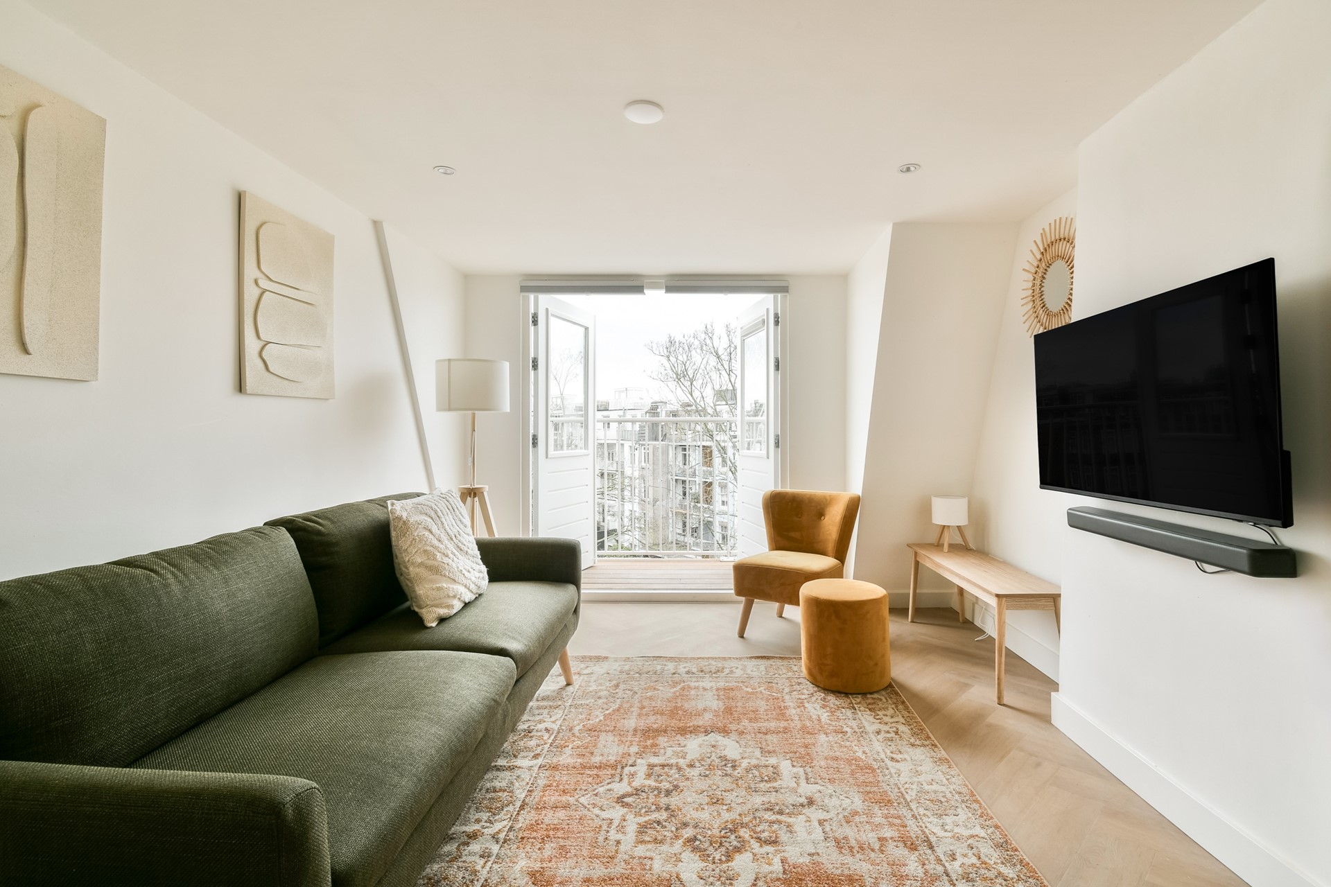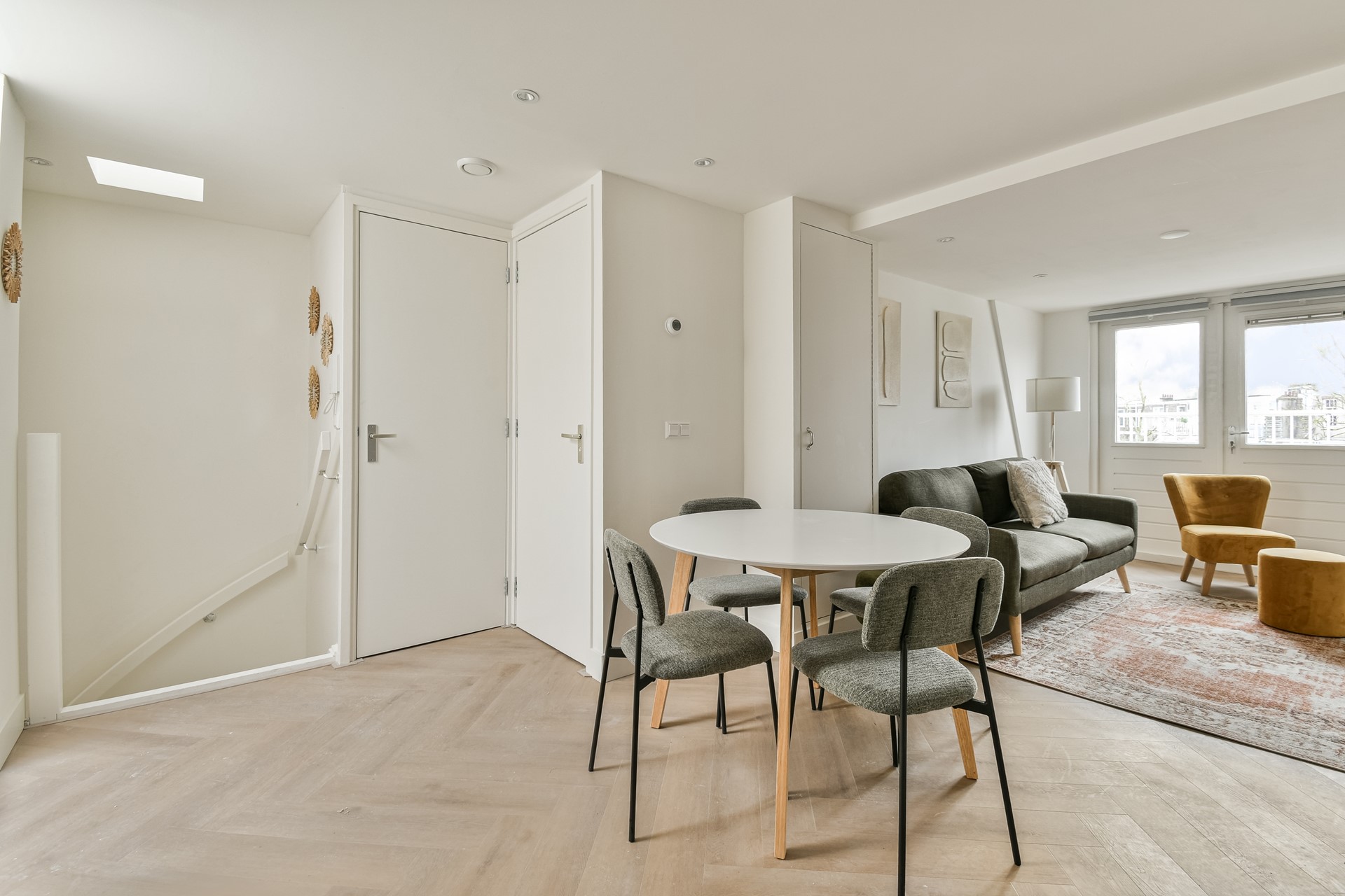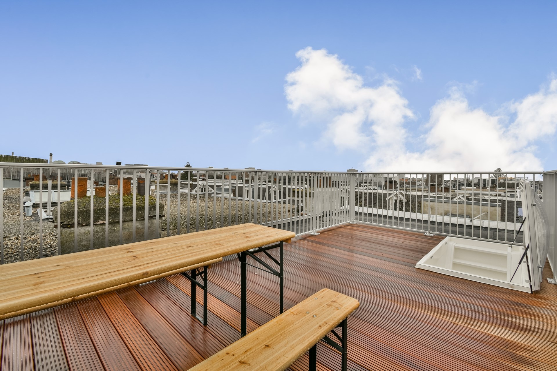 From the living room, a staircase leads to the roof terrace: a wonderful space with seating and open city views — perfect for relaxing or enjoying long summer evenings.