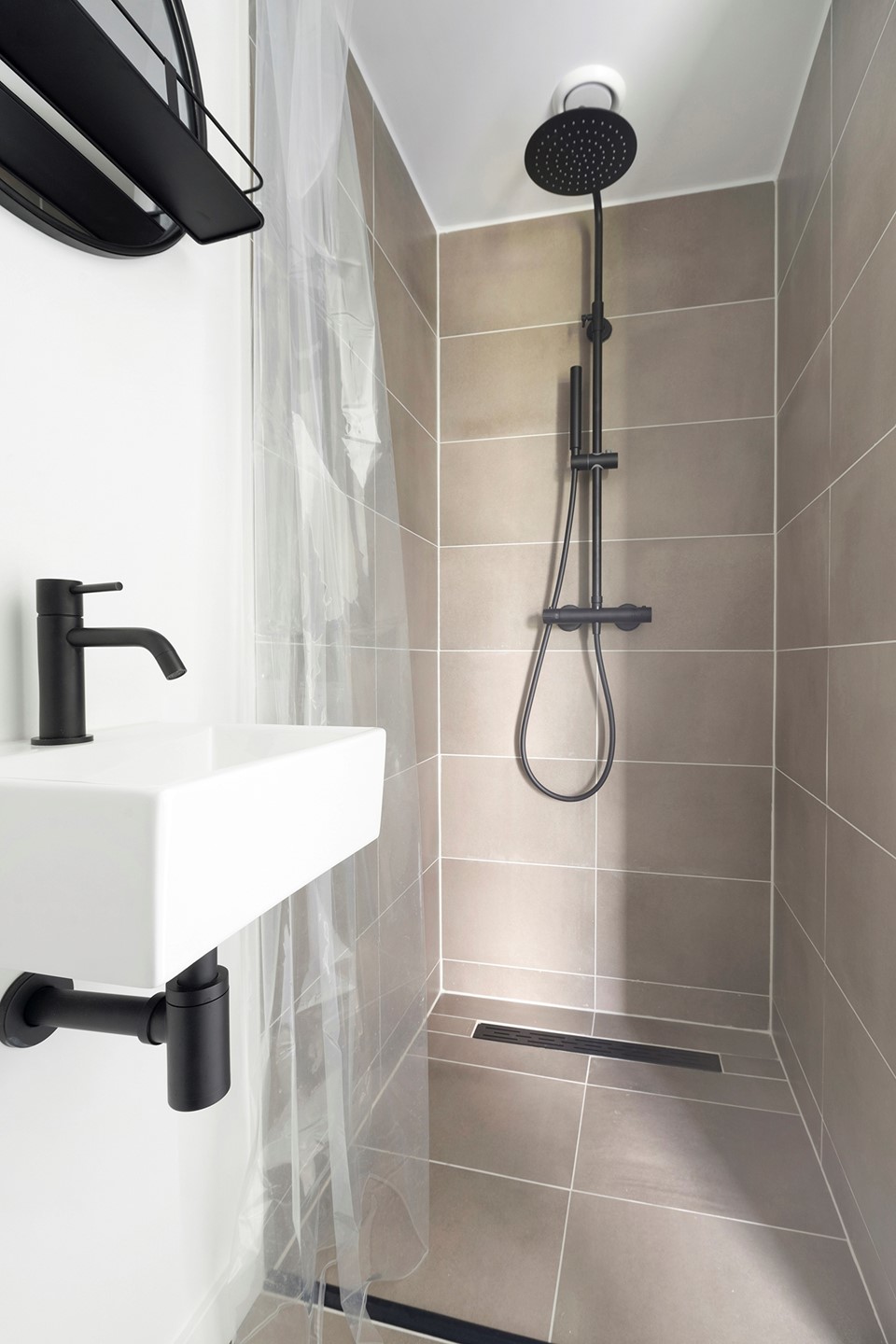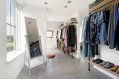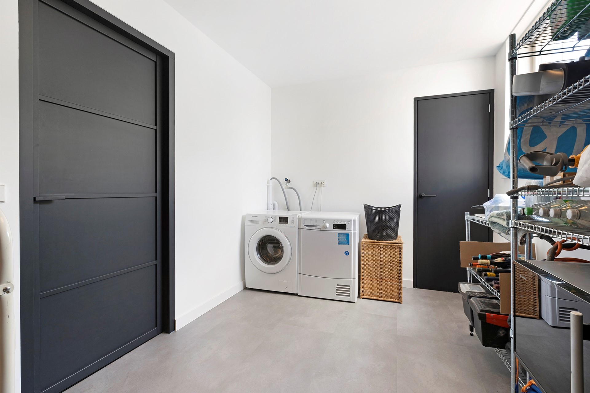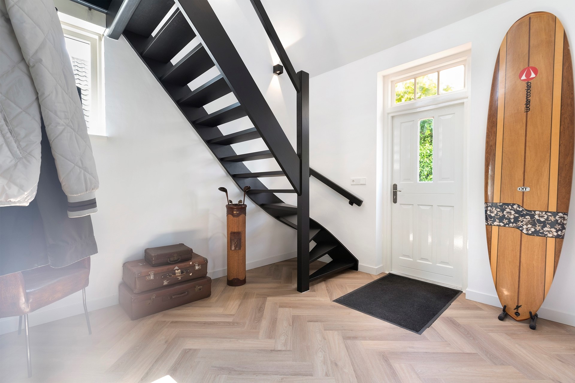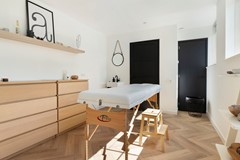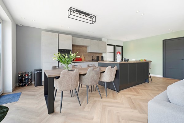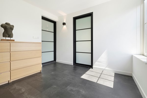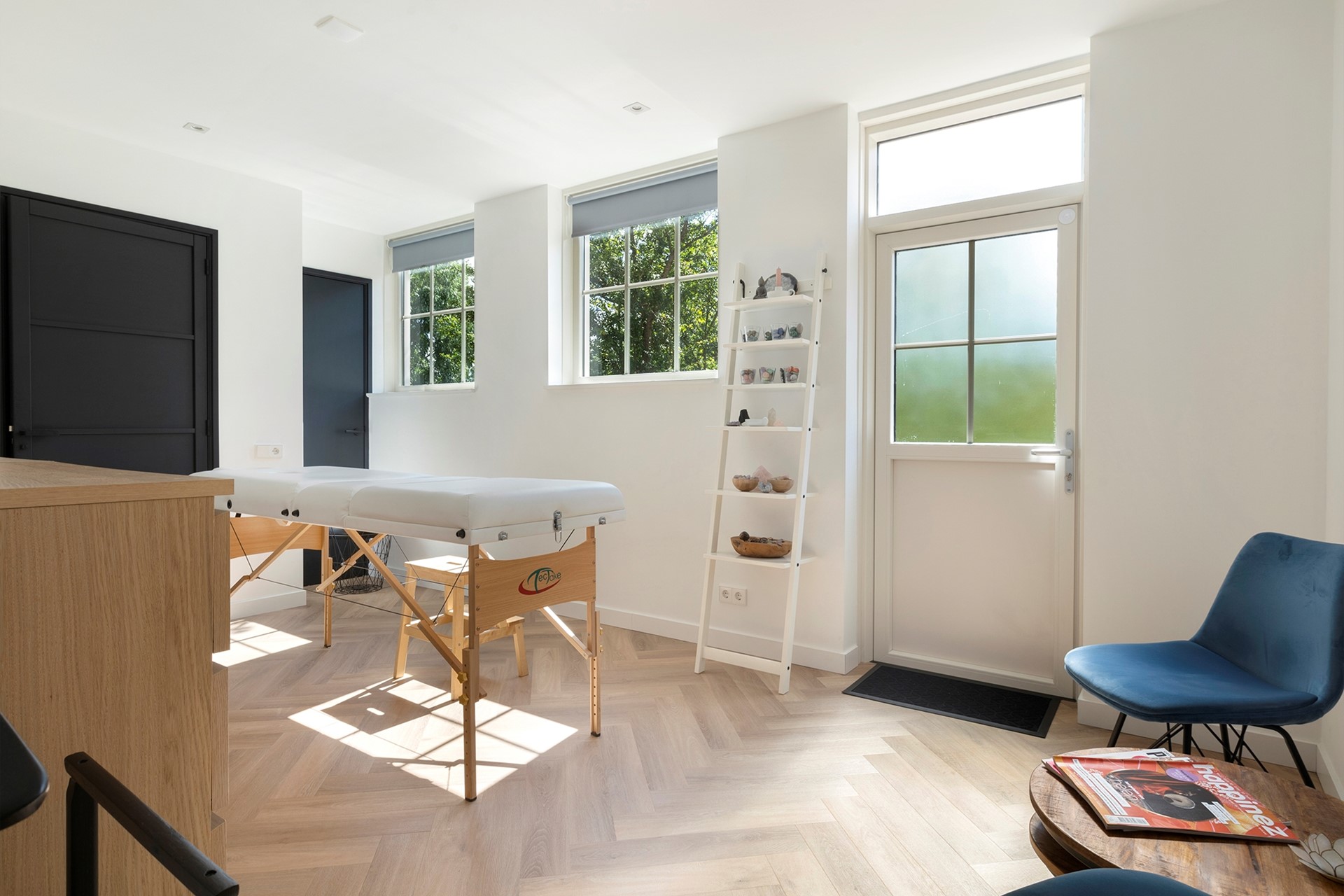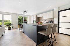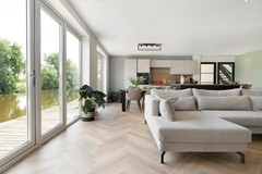 The entrance leads into a spacious hallway with a separate toilet. At the rear, you will find the generous living room with French doors opening onto the terrace, from where you can enjoy stunning views of the water and surrounding nature. The living room features a stylish herringbone floor. The luxurious open kitchen is equipped with a cooking island including Bora, an induction hob, oven, dishwasher, and a fridge with freezer. On the side, there is a practice room or additional bedroom with its own shower and toilet, accessible both from the living room and via a private entrance. The indoor storage room offers ample space and is fitted with connections for a washing machine, dryer, and an electric car charging point.
