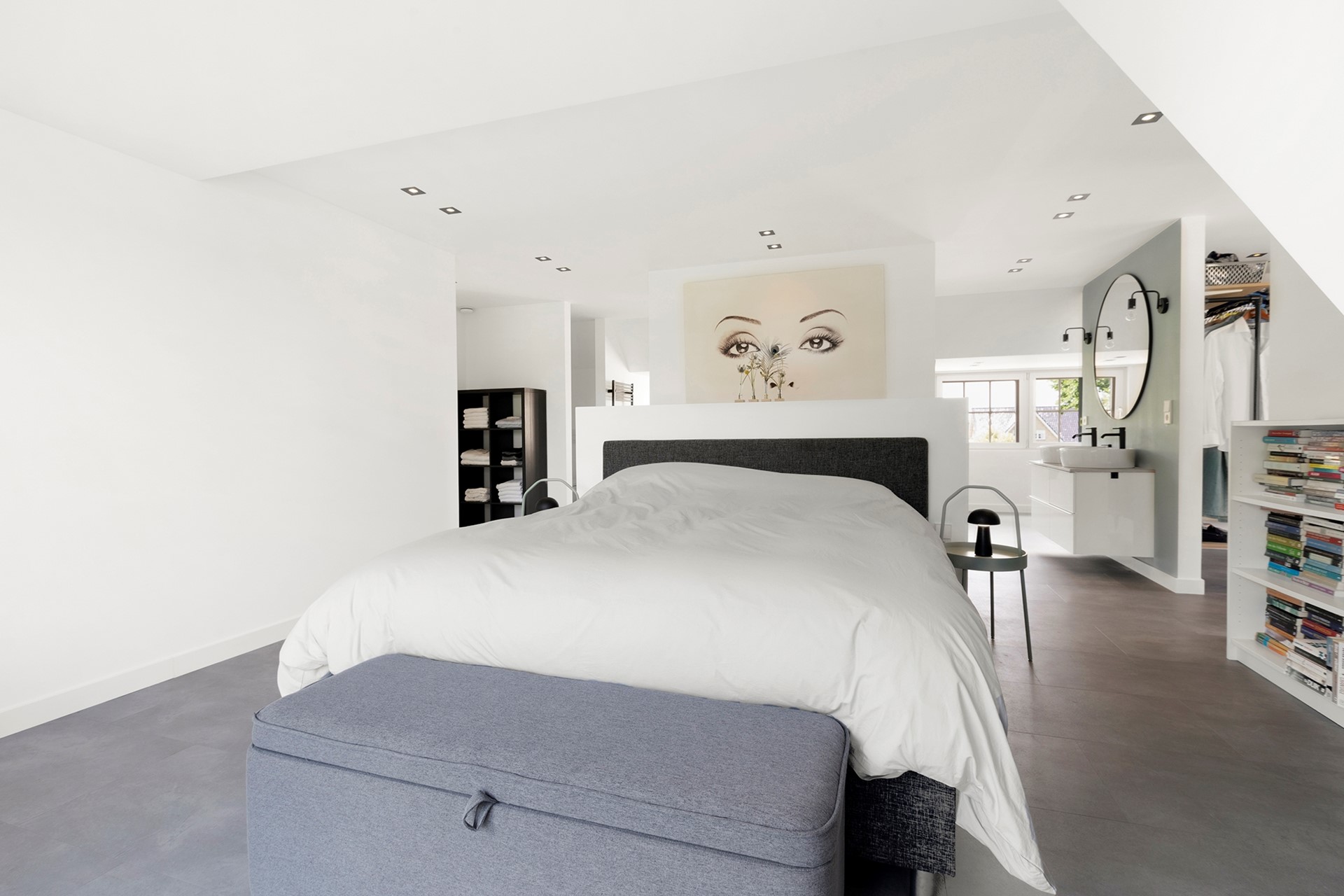 Upstairs, the master bedroom is truly spectacular, with wonderful views and an open bathroom featuring a freestanding bathtub, toilet, double shower, and a spacious walk-in closet. The third bedroom has its own ensuite bathroom with shower and toilet. A fixed staircase leads to the impressive attic. Around the house, several seating areas have been created, allowing you to enjoy the sun, the water, and the green surroundings throughout the day.
